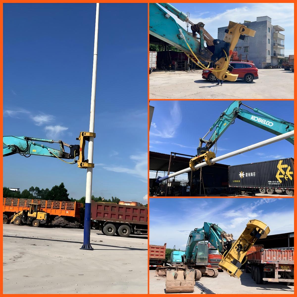 Excavator poles are an operation performed using an excavator to mount poles vertically in the ground. This operation usually requires the arm and bucket of the excavator to dig the soil and place the pole into the dug pit before filling it with soil to secure the pole. The pole clamp has the function of rotation self-locking, cylinder clamping and holding function, which can rotate 360 degrees to better erect the pole and flexibly adjust the direction of the pole.
