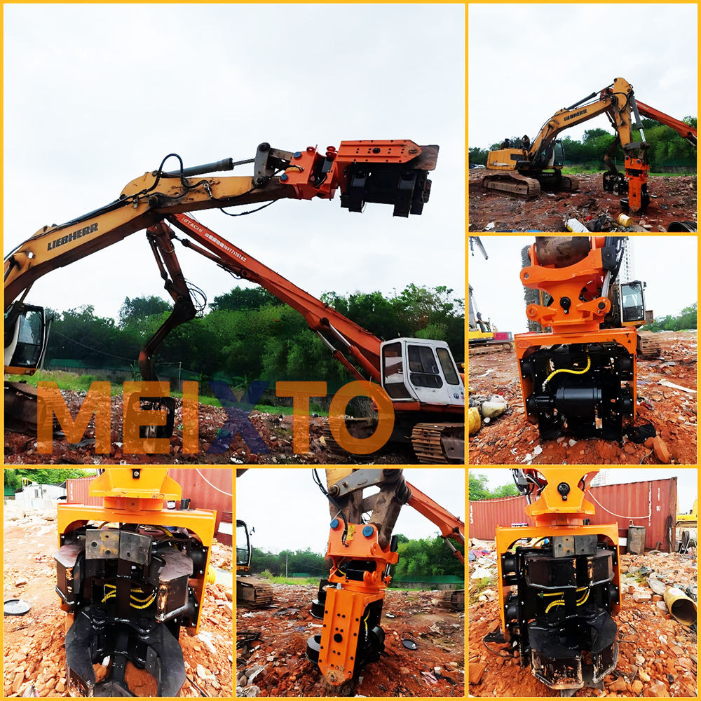 MEIXTO side grip pile driver is always equipped with one arm/clamp system. The unit is equipped with either sheet pile arms, modular arms or modular tube arms, and the standard bottom clamp. The modular arms can further be equipped with clamps for sheet piles, tube piles or timber piles. The tube arms are equipped with the desired size tube pile clamps.