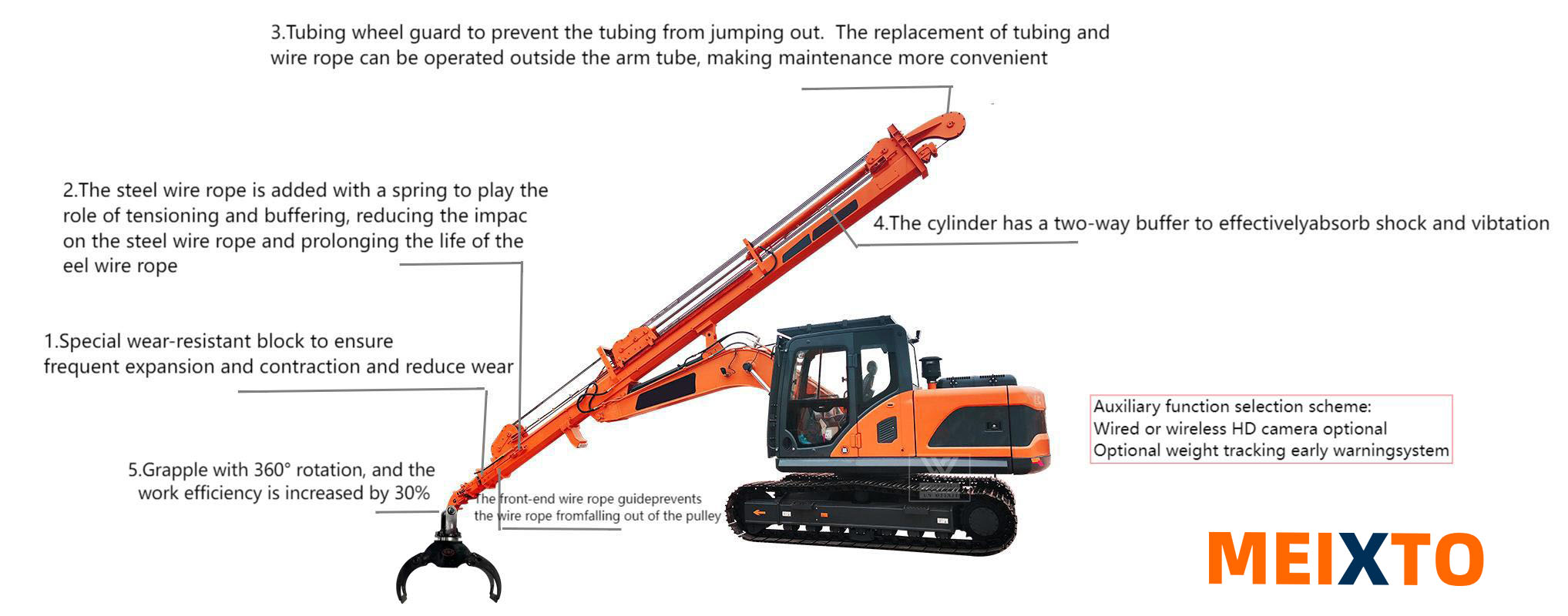 ● Other name:Excavator telescopic arm, forestry telescopic boom, forestry log crane, forest equipment, Forest crane, Forestry telescoping arm, Forest excavator telescoping boom timber crane,log lift crane,crane logs,forestry telescoping boom,wood telescoping boom,timber telescopic arm, forestry cane for excavator, excavator log crane.